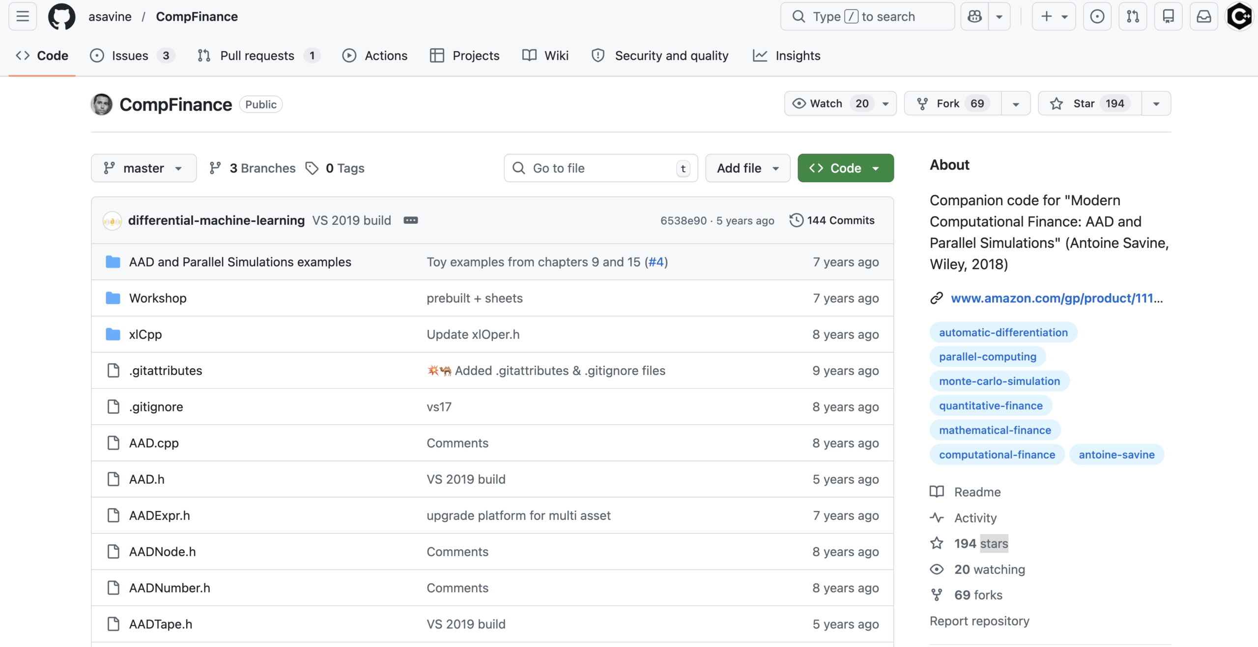 If you’ve ever tried to implement Automatic Adjoint Differentiation from scratch for a real derivatives pricing engine, you already know the gap between understanding the theory and shipping something that actually performs. Antoine Savine’s Modern Computational Finance is one of the few books that closes that gap honestly, and CompFinance is the companion code that makes it actionable. This isn’t a toy implementation tossed together to illustrate textbook concepts — it’s a reference codebase written by someone who built these systems professionally at Danske Bank, and it shows in every design decision.