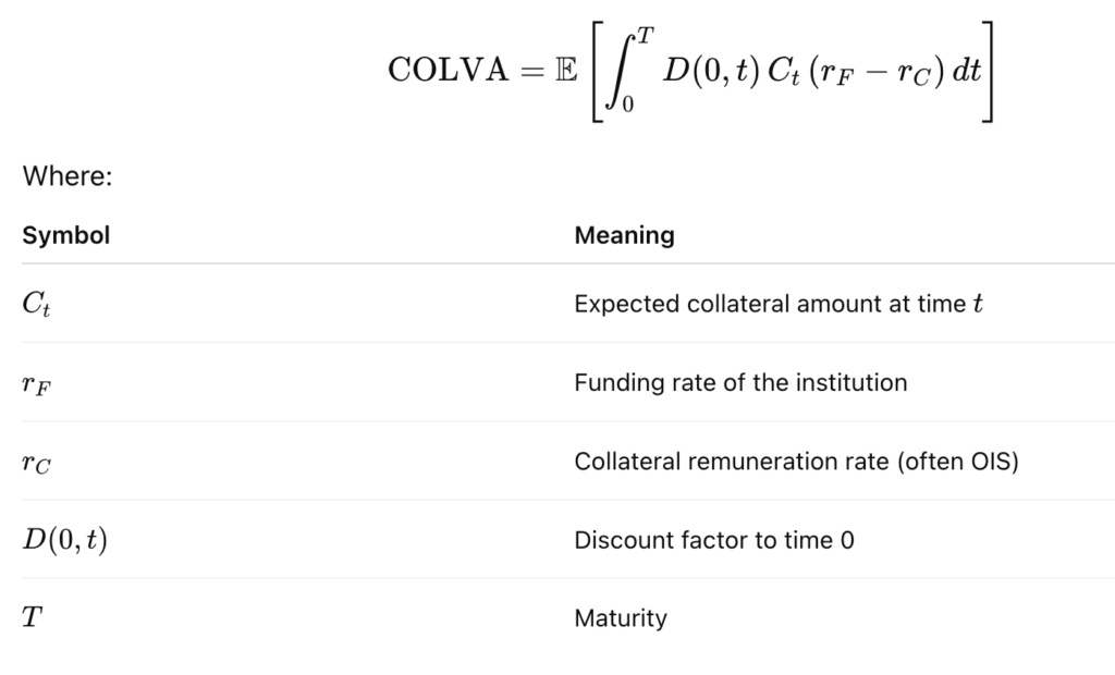 COLVA captures the economic effect of posting or receiving collateral under a Credit Support Annex (CSA). It reflects the remuneration of the collateral account and the mechanics of discounting under different collateral currencies.